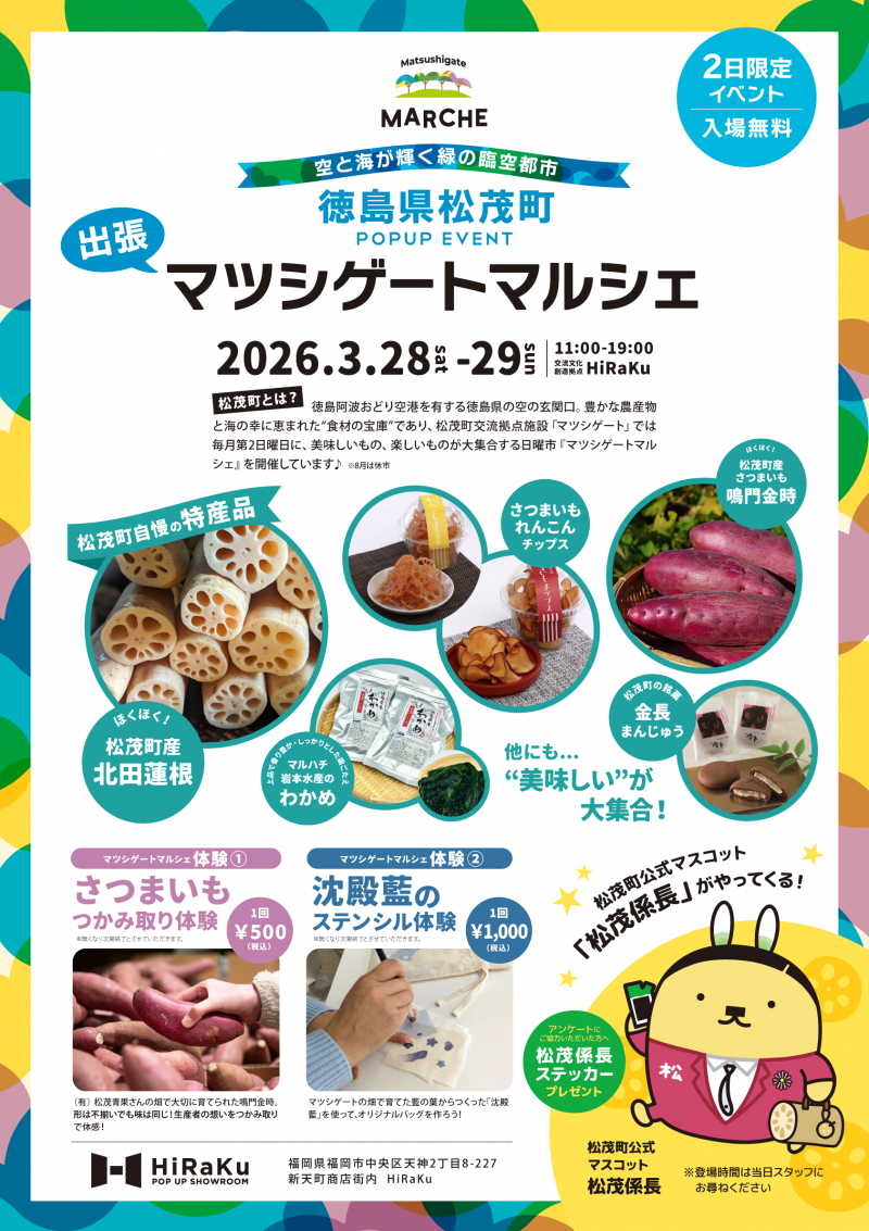 3月28日(土)~29日(日)の2日間限定で、「出張!マツシゲートマルシェ in HiRaKu」を開催いたします。